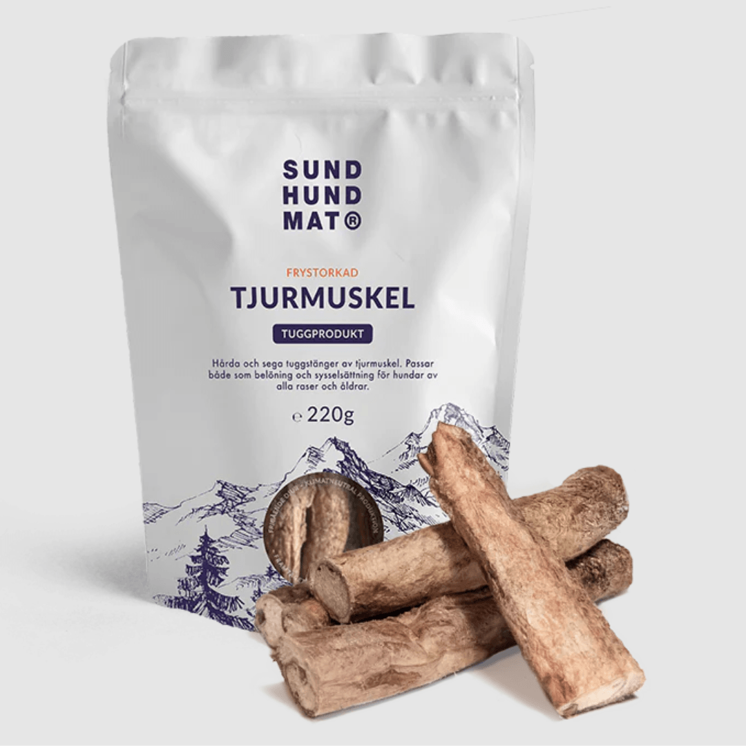 Seje tyggestænger lavet tyremuskel (penis). Frysetørret tyremuskel er en del af Sund Hundmat serie af frysetørrede tyggeprodukter til hunde, der er specielt udvalgt til at give stimulering til hundens tænder og kæber. De kan gives som aktivering, belønning eller ekstra tilskud når som helst.