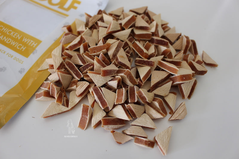 Woolf Triangle godbidder, er små bløde rektangler med kød og torsk. En lækker lille forkælelsessnacks eller godbid til din hund. Godbidderne fedter ikke og er derfor nemme at have med i lommen på lufteturen og lign. De brækkes nemt i mindre stykker og kan derfor bruges som træningsgodbidder.