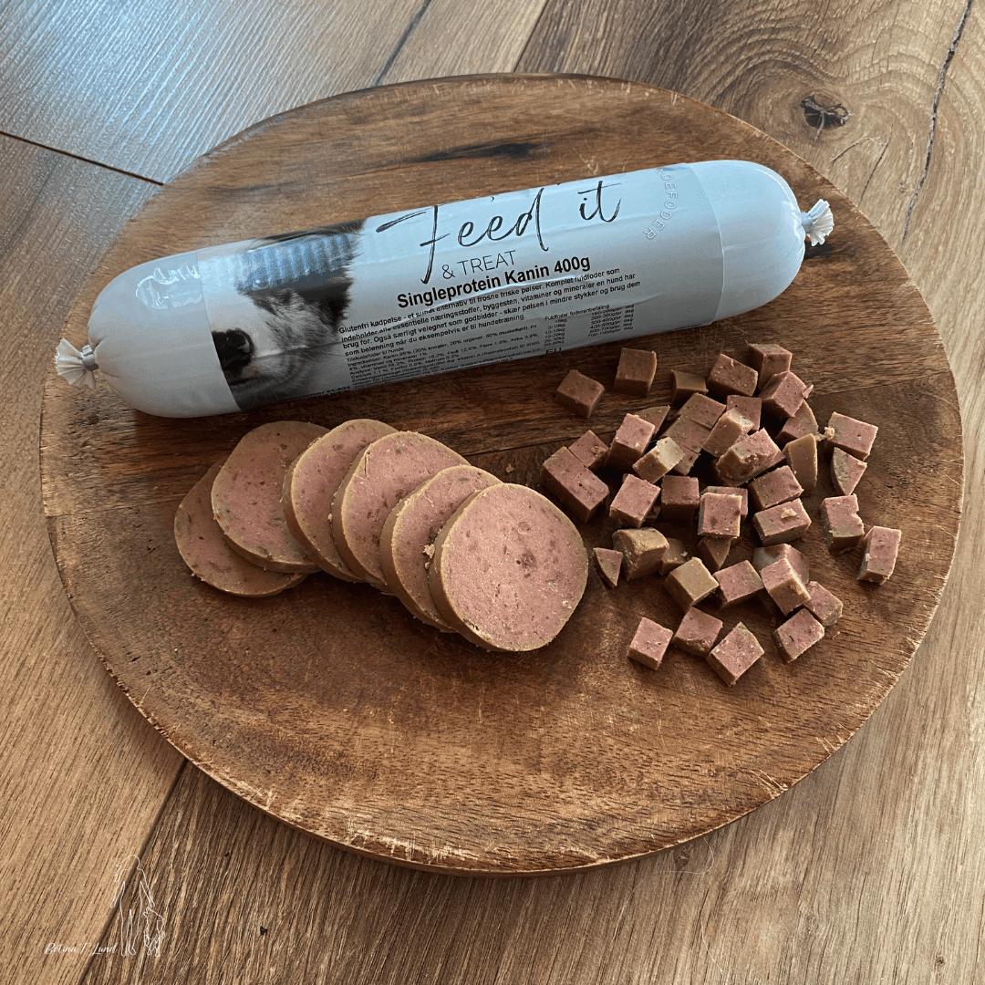 Feedit & Treat er dampede glutenfrie kødpølser, som er skærefaste som godbidspølser og derfor kan bruges som godbidbidder. Skær pølsen i mindre stykker og brug dem som belønning når du f.eks. er til hundetræning.