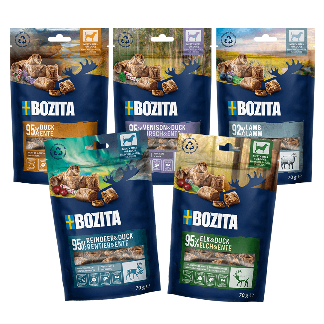 Bozita Meaty Bites er lækre kornfrie hundegodbidder lavet med naturlige ingredienser og af det fineste udvalgte kød. Godbidderne har et kødindhold på 95%, tilsat arktiske bær samt urter, inspireret af den nordiske vildmark.