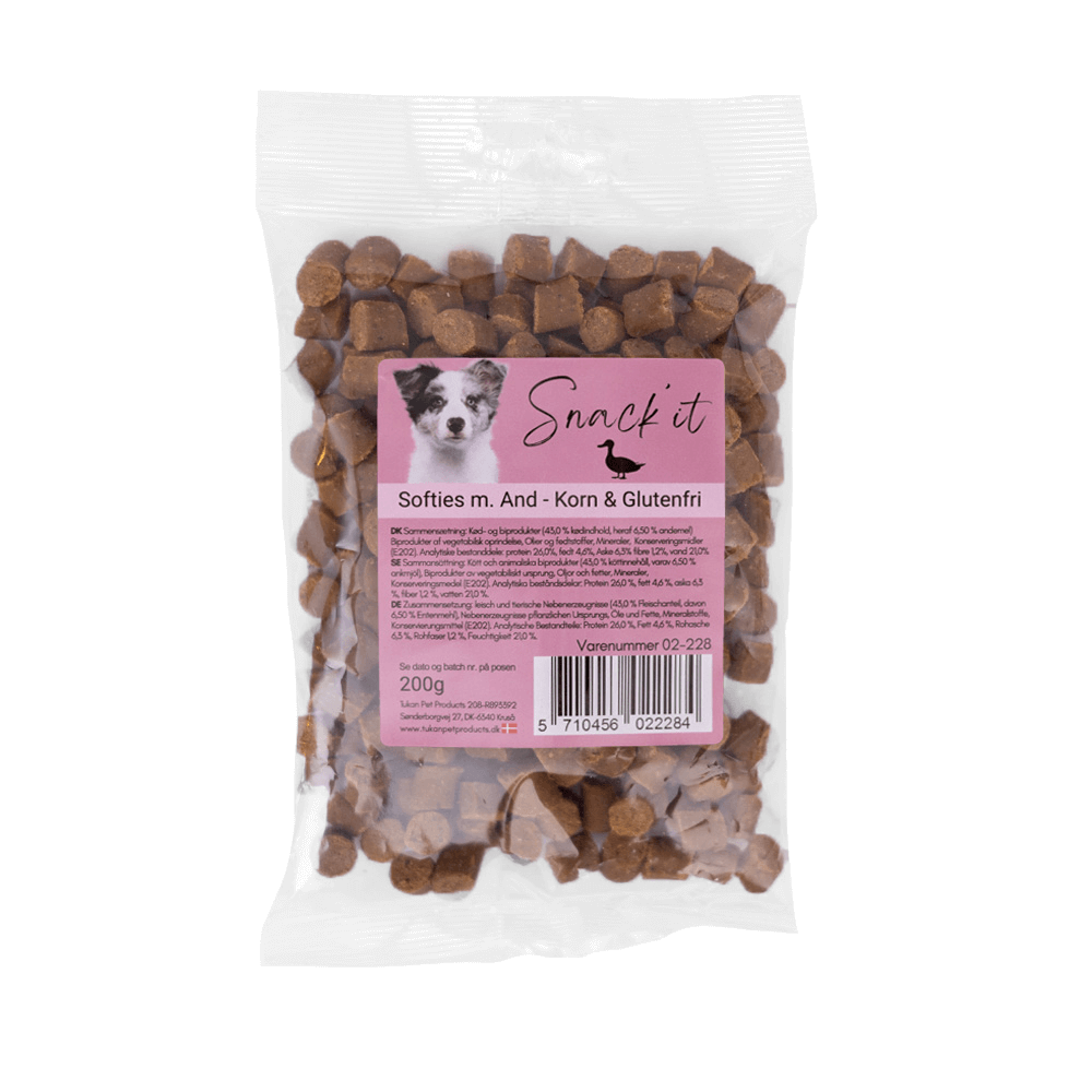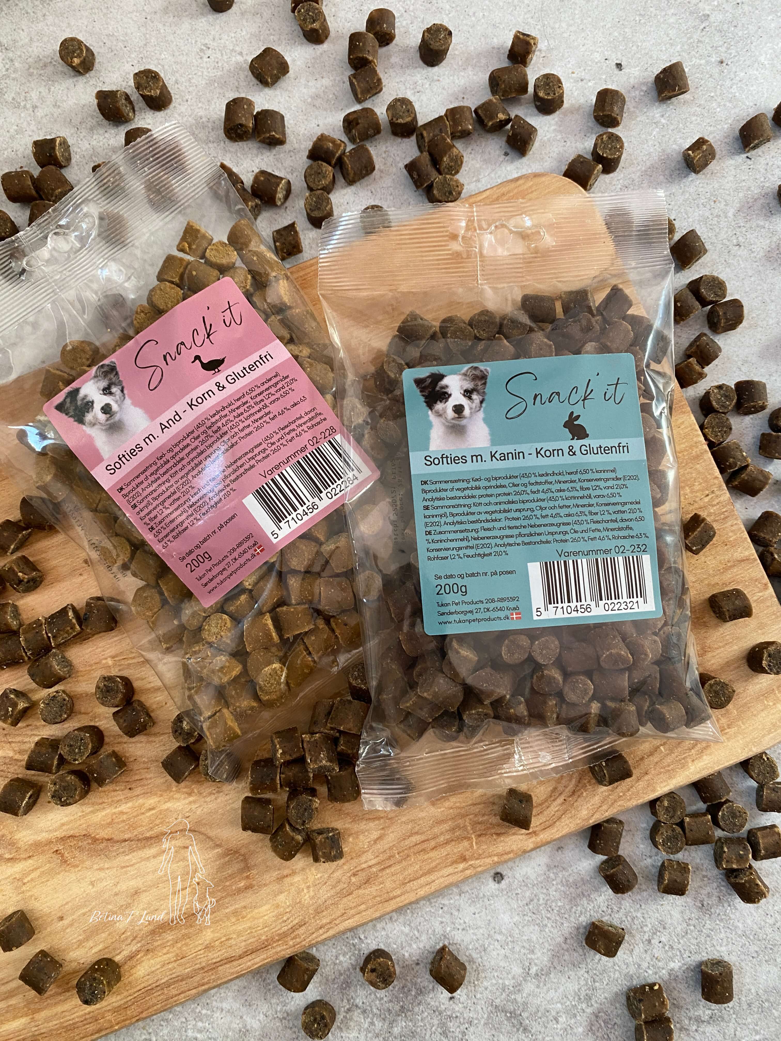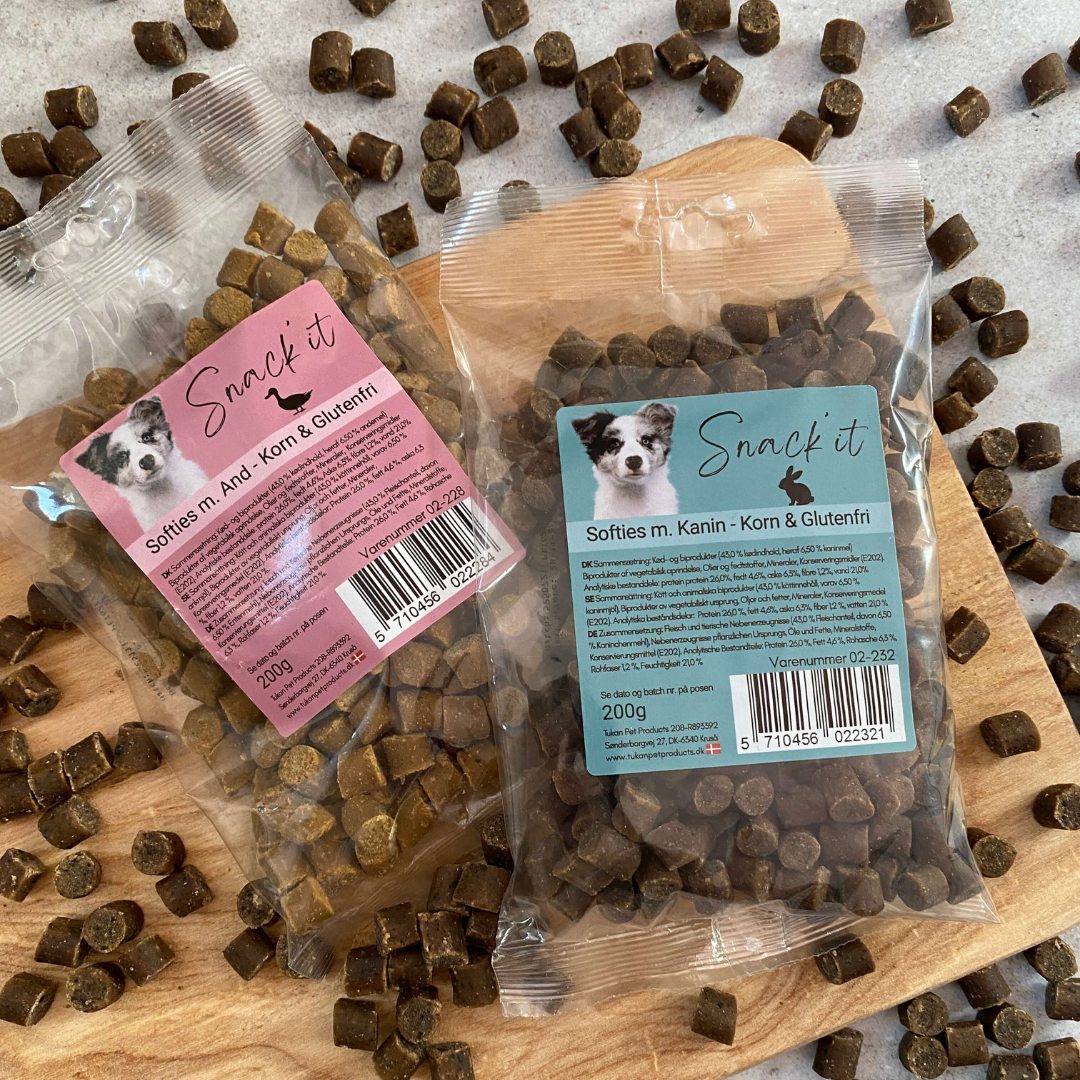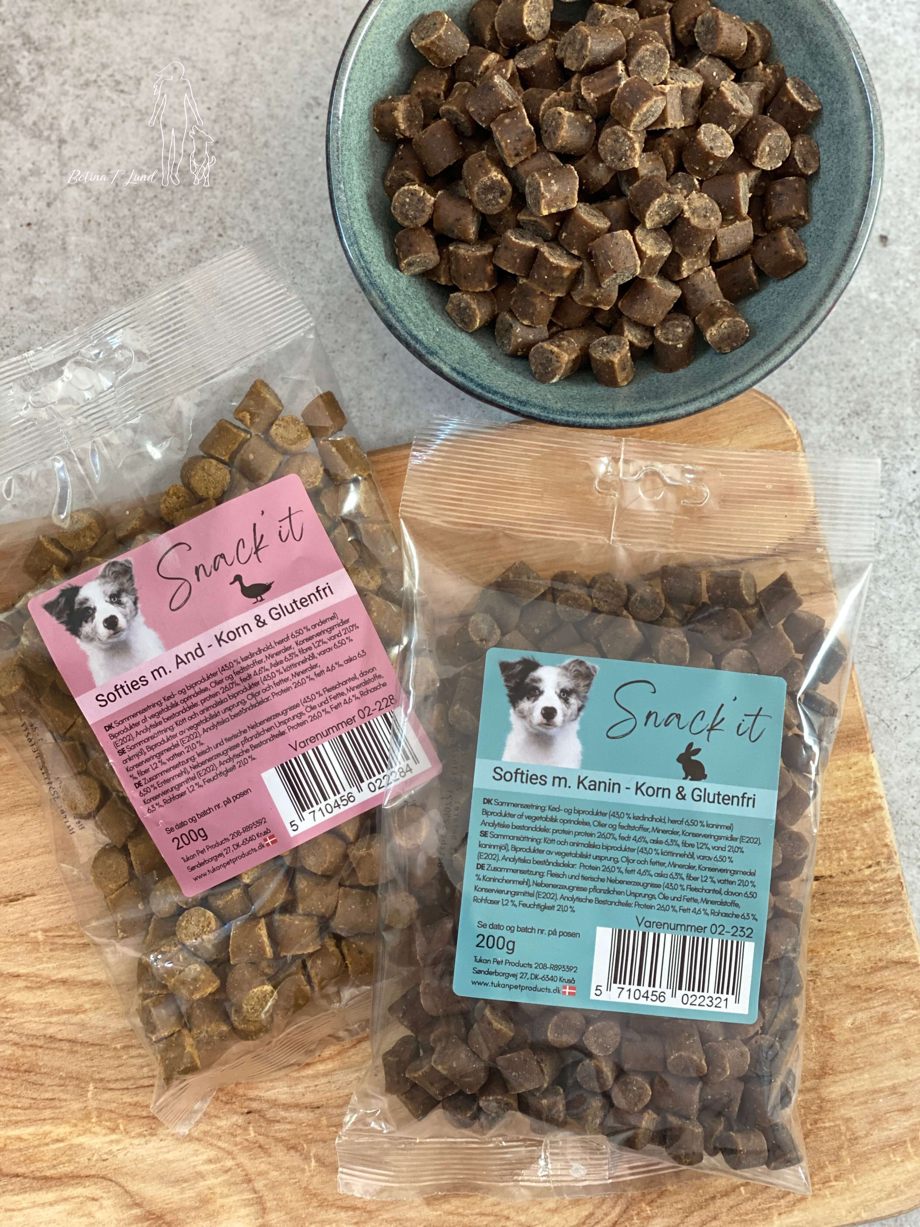 Snack'it Softies, er små bløde godbidder der egner sig godt til træning, da bidderne er bløde og i mundrette bidder.