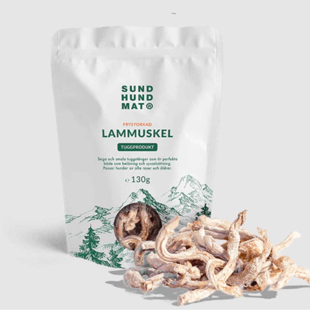 Seje og tynde tyggestænger lavet af lammemuskel (penis). Frysetørret lammemuskel er en del af Sund Hundmat serie af frysetørrede tyggeprodukter til hunde, der er specielt udvalgt til at give stimulering til hundens tænder og kæber. De kan gives som belønning eller ekstra tilskud når som helst.