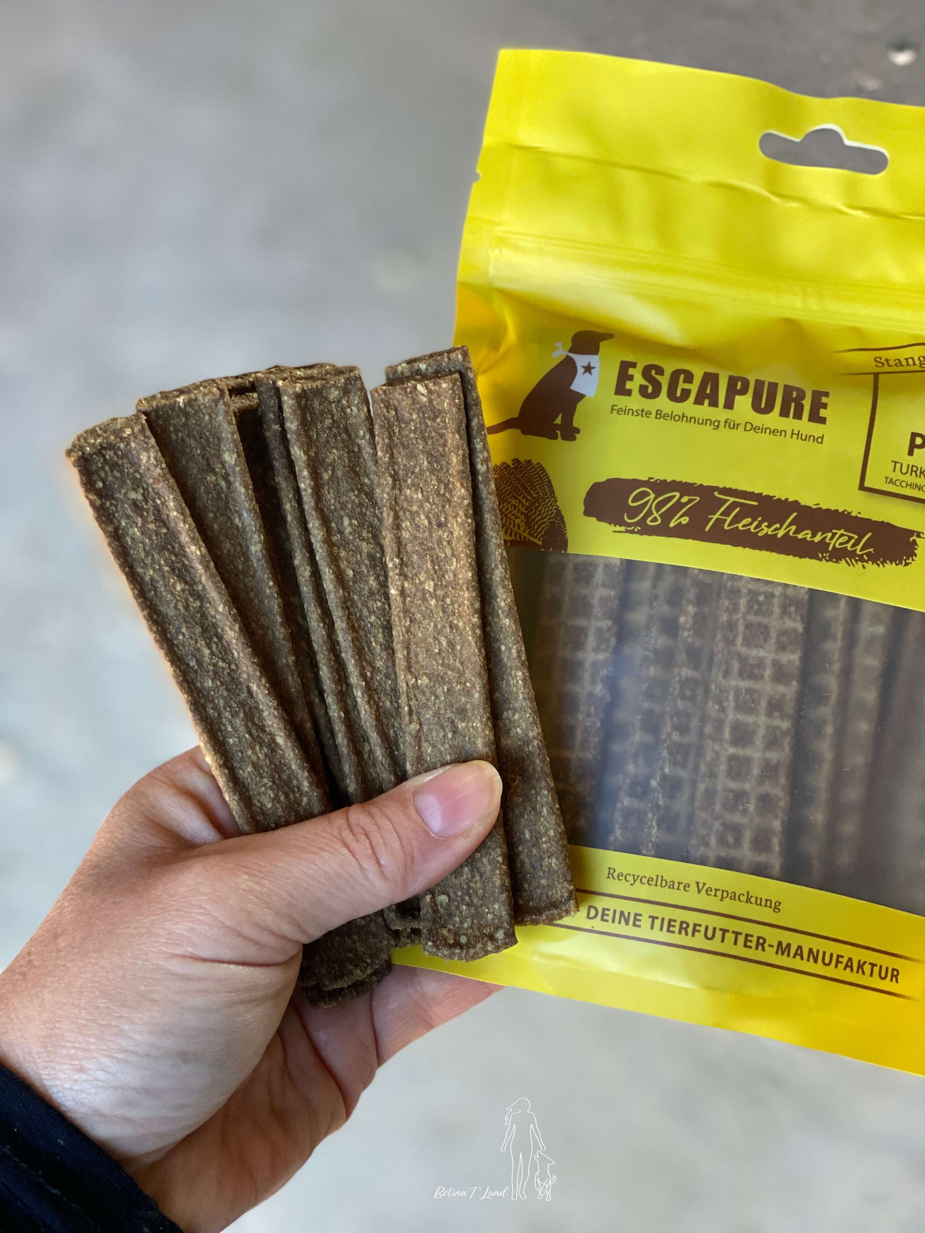 Escapure stangerl er ækre kødstænger lavet af 98% ren kalkunkød. Og så er der tilsat 1,5% æblefibre og 0,5% havsalt.